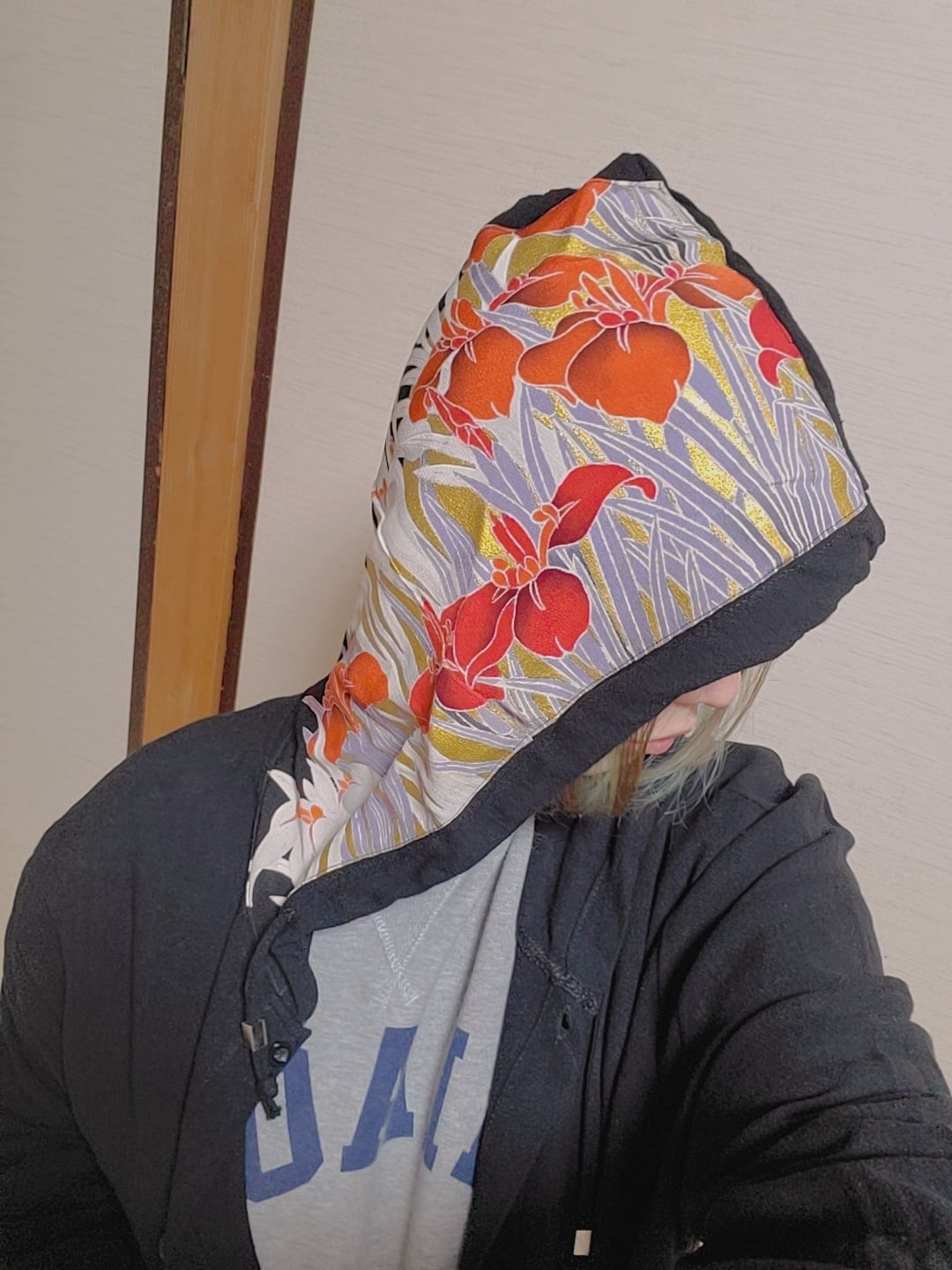 黒のストレッチ素材のパーカーに、着物を手縫いで縫い付けております。
